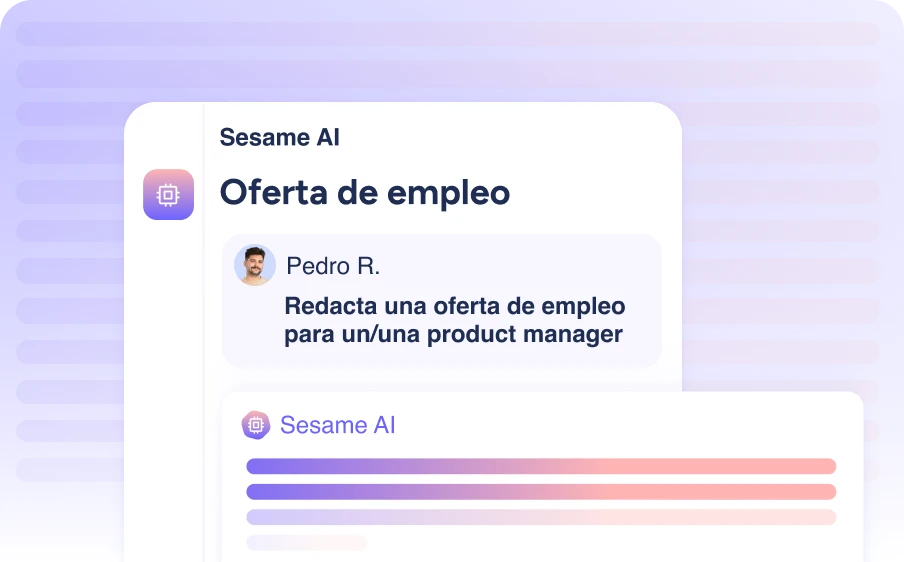 Aplica la Inteligencia artificial en tu software de RRHH para analizar datos a la velocidad de la luz. Sesame AI analizará tus evaluaciones, redactará comunicados y te asesorará en tus decisiones.