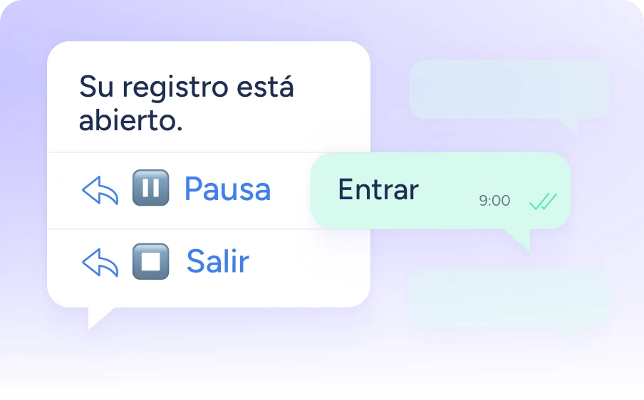 Permite a tu equipo fichar su jornada laboral por WhatsApp. Los empleados podrán marcar entradas, pausas y salidas, mientras tú llevas un seguimiento detallado desde Sesame.